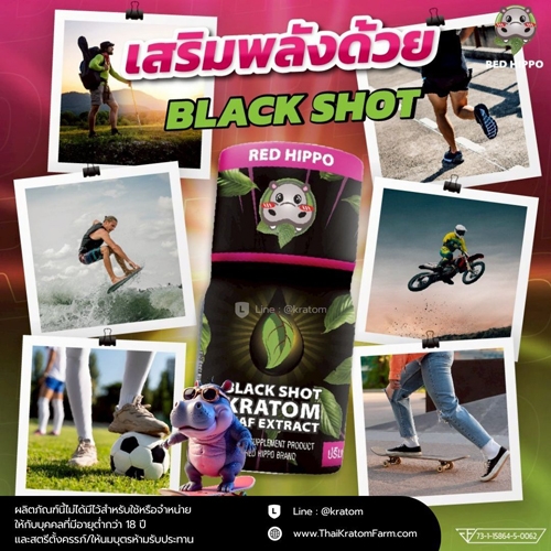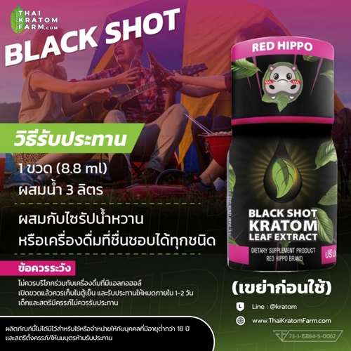 น้ำกระท่อมสกัดเข้มข้น เรดฮิปโปแบล็กช็อต สกัดจากกระท่อมสายพันธุ์ก้านแดง ปลอดภัย ผลิตภัณฑ์คุณภาพมาตรฐานในระดับสากลและเป็นมิตรกับสิ่งแวดล้อม มุ่งเน้นให้เกษตรกรไทยมีรายได้อย่างยั่งยืน เราเลือกกระท่อมที่มีอายุไม่ต่ำกว่า 5 ปี เพื่อให้ได้สารสกัดไมทราไจนีน (Mitragynine) เข้มข้นและสารสำคัญอื่นๆแบบฟูลสเปกตรัม ผลิตภัณฑ์สารสกัดธรรมชาติ (หัวเชื้อเข้มข้น) 180 มิลลิกรัมต่อขวด ไม่มีคาเฟอีน: สดชื่นแบบไม่ใจสั่น และคุ้มค่า: 1 ขวด ผสมได้ 3 ลิตร ออกฤทธิ์ไวภายใน 5 นาทียาวนานกว่า 6 ชั่วโมง ช่วยเพิ่มความกระปรี้กระเปร่า ตื่นตัว ลดอาการปวดเมื่อย ทำงานได้สบายตลอดวัน ไม่มีน้ำตาล ทานง่าย สะอาด ไม่ต้องต้ม ไม่ต้องเคี้ยว ไม่ต้องเสี่ยงเป็น “ถุงท่อม” เป็นผลิตภัณฑ์กระท่อมที่ผลิตจากโรงงานที่ได้รับอนุญาต มาตรฐานระบบการผลิตตามหลักเกณฑ์ของกฎหมายอาหาร (GMP, FDA/GMP อย.)